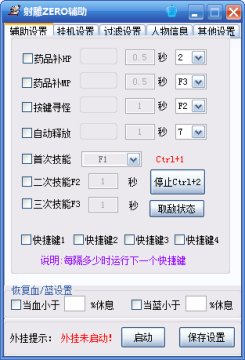 射雕zero辅助拥有自动不足药品、自动回血、回魔,能够加速移动、攻击速度,能够过滤打怪、品物等,支持自动挂机、自动喊话、自动做任务,是完美世界游戏射雕zero的辅助工具。