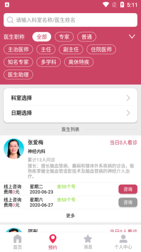 1、进入软件的门诊预约中心,选择预约知名专家或普通专家