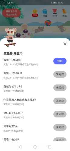 养鼠记是一款合成分红小游戏,经典的玩法、拖拉合成小老鼠,升级领红包、拿分红。升级到5级可领取首个红包,后续完成更多任务可获得更多现金红包或金币奖励。