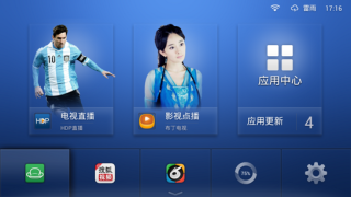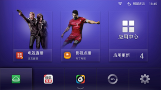 首页提供了电视直播、影视点播、应用中心三个最常用功能,以及数个自定义位置,开机一键看电视、看电影,操作更便捷。