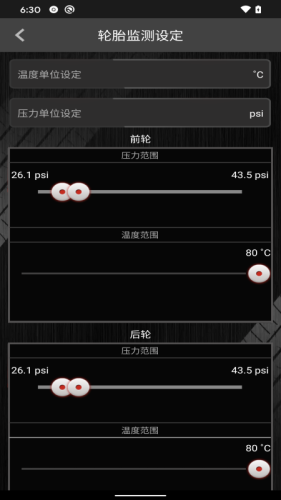 3、胎压单位设定(psi, kPa, Bar),胎温单位设定(℉,℃),及上下限值设定。