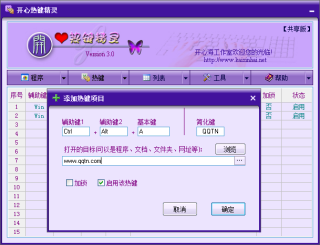 开心热键精灵是一款非常强大的高效率电脑操作软件,通过设置电脑各种热键,可以快速对电脑进行操作,有了这款软件,您在键盘上随手按几个键就能瞬间运行一个程序、或者打开一个文档、浏览一个网页,比如按Ctrl+B打开百度、按Alt+Q打开QQ,再也不用从一层层的开始菜单或者乱七八糟的桌面上去找那并不快捷的"快捷方式"了,就是这么神奇!