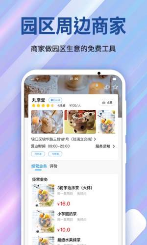 园畅,定位园区,畅享专属自己的资源生态。对园区周边商户而言,园畅=客源。