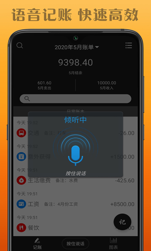 支持语音智能记账,可以导出Excel文件。简单的操作流程,轻松上手 语音记账:点击按住说话按钮 可实现语音识别功能。