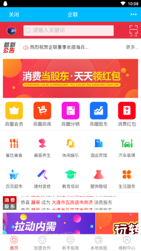 企联app,提供商圈会员、商圈商库、商圈分销、商圈股东、消费红包等频道,帮助创客们都能享受最好的资源服务,支持餐饮美食、美容养生、休闲娱乐、酒店宾馆、汽车装潢、百货超市等一系资源。