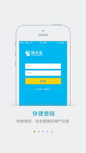 移小宝是专门针对手机平台研发的安全支付产品。突破传统密码支付模式,移小宝通过向持卡人银行预留手机号码发送短信验证码,服务器验证短号进行快捷支付,无需密码输入,减少用户繁琐操作,一个刷卡器一张银行卡即可在智能手机上轻松实现收款、余额查询、手机充值等各类金融功能。