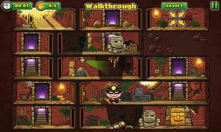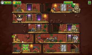 4、非常有趣的玩法,点击屏幕让鲍勃前进,观察路线,从可以通过的门进入另一个房间,遇到一些机关要想办法通过,不同的机关通过的方法不同,遇到木乃伊要趁他不注意的时候将他打晕,有锁的门用万能钥匙打开,有摄像头的地方要注意躲避,遇到电梯要去其他的地方找密码,还有各种障碍等你来解锁,当然最重要的就是和搜集金币。