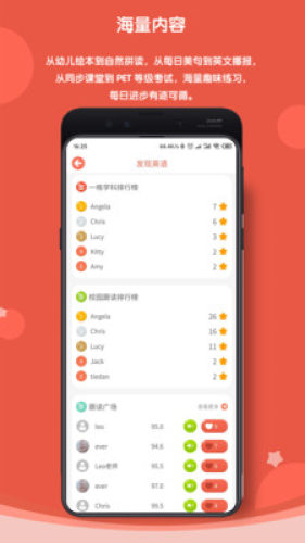 海量内容:从幼儿绘本到自然拼读,从每日美句到英文播报,从同步课堂到PET等级考试,海量趣味练习,每日进步有迹可循。