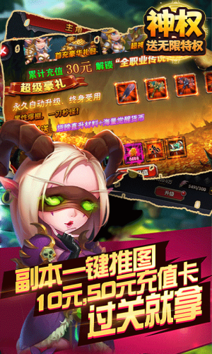 《神权-送无限特权》是一款致敬魔兽题材挂机策略手游。免费赠送无限特权,道具买到爽,游戏玩法丰富,各种经典魔兽副本悉数完美还原!T1,T2等套装也让你能重温那个经典的年代!暴力修改,钻石好打,商城道具无限购买,副本狂掉材料,不花钱一样玩,花点小钱爽翻天;