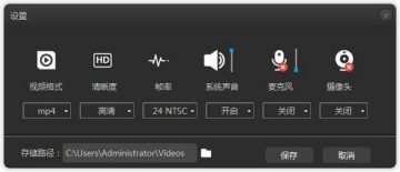 步骤三:在软件主界面右边点击齿轮设置按钮进入视频参数界面。对视频格式、视频清晰度、视频帧率等基础视频参数进行设置,设置出符合自己要求的视频水准。另外在这个界面上还可以选择是否开启系统声音开关、麦克风开关和摄像头开关,选择视频的存储路径。设置完毕后,记得检查一般再进行保存。