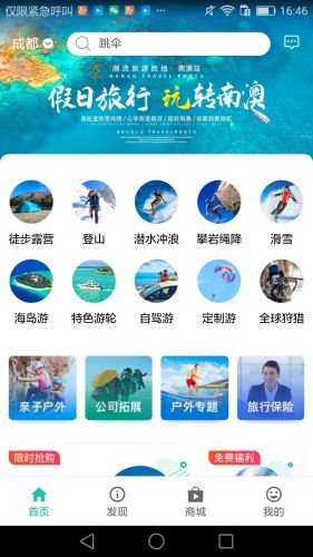 本旅行平台包括旅行,发现,商城,三个板块,主要旅行行程产品在“旅行”板块购买和参与,主要涉及如特色游轮,特色海岛,登山,攀岩,滑雪,冲浪,徒步,跳伞,狩猎,越野跑,马拉松,公司拓展活动,亲子户外,周末户外,定制旅行等等旅行行程及活动。