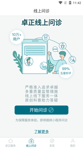 卓正医疗app,专业的线上医疗服务平台。覆盖全国11个城市、200多名专业医生坐诊,提供24小时预约就诊、线上问诊功能,以患者为中心,全方位呵护健康。