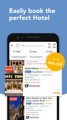 ● 用筛选功能方便挑选酒店:按价格、区域、设施等筛选