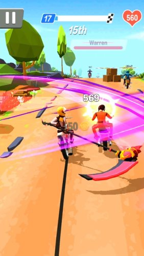驾驶竞速类手机游戏,这款游戏采用了简洁又炫酷的卡通画风,玩家可以在这里感受到紧张刺激的摩托竞速,使用各种道具来打击对手,让他们速度降下来,争做第一名。