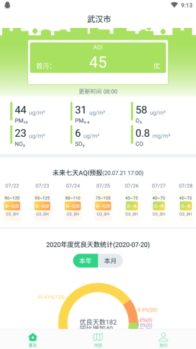 拥抱蓝天app,专为武汉空气质量打造的空气指数预测应用,在此可以以每小时的状态显示当前空气质量,为武汉出行带来一定指示性的作用。