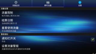 1.流量监控:查看2G/3G和Wifi的使用流量情况。并且可以设置流量警报值,一旦接近警报值通知栏里的图标就会提醒您已设定的流量即将用完。