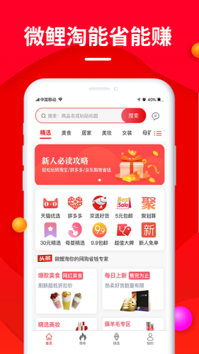 微鲤淘-是一款专注于购物返利,网购省钱的APP,淘宝网/天猫京东/拼多多等各大主流购物商城,购物下单前先领券。一年能省好几千。