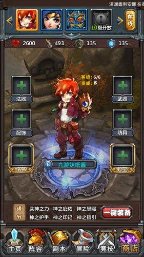 装备分成A、B、C、D四个品质,又分为头盔、武器、腰带、防具、珍宝和法书,装备可增加人物的攻、血、物防、法防四个基础属性;