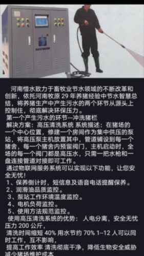 2、 目前公司的节水产品主要是:清洗系统、 造雾系统、 饮水系统、玻璃钢料塔 本公司位于河南郑州市金水区。主营牧场高压清洗系统、饮水系统、人造雾系统、玻璃钢料塔等。