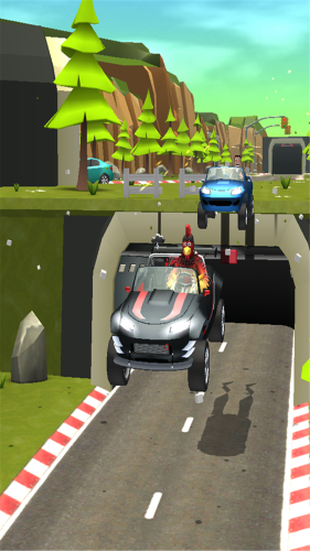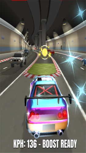 一款惊险刺激的赛车竞速类游戏。玩家只需要控制一辆车来躲避所有的障碍物和陷阱,在游戏的过程中收集一些金币。收集到的金币可以拿来购买高级的车辆。