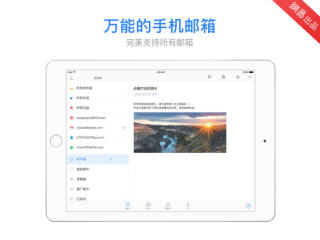 邮箱大师iPad版是网易邮箱官方2014新推出的一款邮箱客户端应用。邮箱大师能够支持所有的邮箱;新邮件能够即时推送;多平台支持,完美适配Android和IOS两大平台。给用户提供最安全最方便的免费邮箱服务。