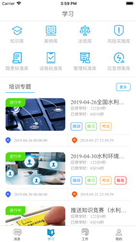 博安通app是武汉博晟安全技术股份有限公司推出的一款培训学习平台,平台拥有消息,学习,工作,我的等功能板块,可以帮助用户更好的学习工作。