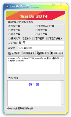 本森广播代码生成器是一款专用的房间广播HTML代码生成器,可以生成文字广播、视频Flash广播、图文广播、软件广播、声音广播、命令广播等多种类型的代码。适用于新浪Show/51VV/呱呱等各类聊天平台,管理们可以通过此软件方便的发送房间广播。