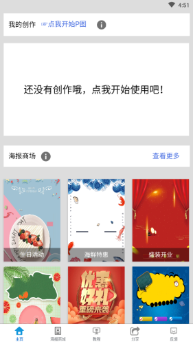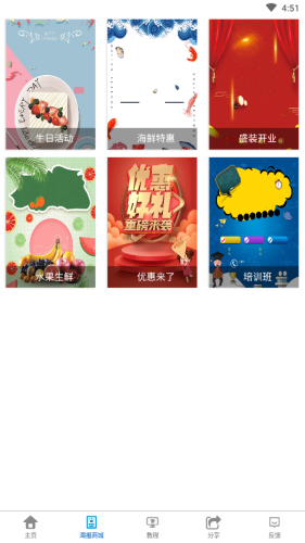 8、海报商城功能, 打开海报商城,进入创作好的海报模板,只需要编辑文字、添加图片、编辑颜色就能完成各种场景的海报创作!