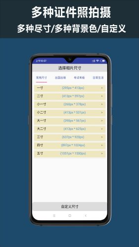 1、证件照拍摄:通过前/后置摄像头拍摄人像(前置操作方便,后置效果更好),制作不同像素尺寸、不同背景色的证件照;用户可对照片进行美颜处理,还可以自定义尺寸(单位:像素),满足个性化需求;用户可保存、分享生成的证件照。