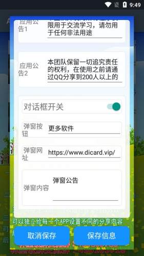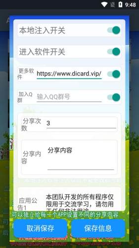 三、网络注入后,可以进行弹窗内容修改,可以独立给每一个APP设置不同的分享内容。