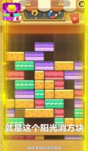 阳光消方块红包版是通过轻松消除方块,以获得大额红包福利的版本。在这里玩家通过将不同颜色方块串联起来进行消除,就可以升级闯关成功,就能消除方块啦。第一关五元,第二关十元,越往后面玩福利越多,赚的钱也直接提出来哦。