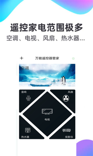 万能遥控器管家app,极简单操作界面,设计一目了然操作简便;遥控家电范围极多,空调、电视、风扇、热水器;智能空调遥控器,告别传统电池遥控器;极简单操作界面,设计一目了然操作简便。