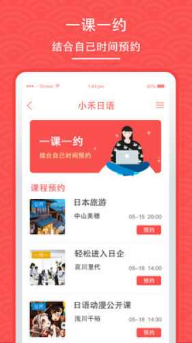 4、按需预约:小禾日语app告别传统报名了可能没时间学,采用一课一约制。