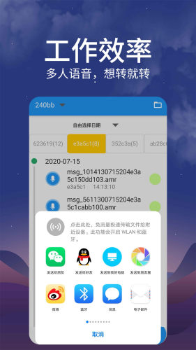 微信转发语音是一款好友语音转发软件,致力于帮助保险、微商、律师、客服等长时间使用微信语音对话的人群提高工作和学习效率,解决微信语音无法转发及分类管理的难题,帮助您告别重复说话,工作快人一步;微信转发语音软件还支持合并转发语音,微信语音合成导出,将碎片化的语音变为整体规范的资料,方便整理查找与转发分享。