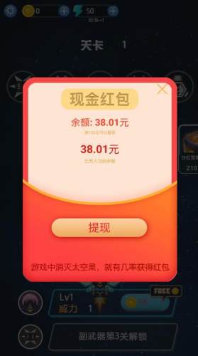 游戏中玩家驾驶自己的飞机在外太空进行作战,玩家可以将附带有红包奖励的道具打爆就可以领取红包奖励了;