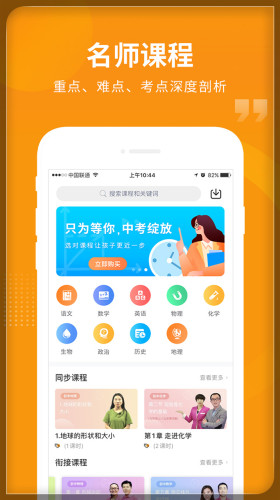 同步课程、衔接课程、精品课程,上万节精品学习课程,国內名师倾情授课涵盖国內初中各大版本教材,细心讲解初中各个年级各个学科的知识点,再也不怕上课听不懂。