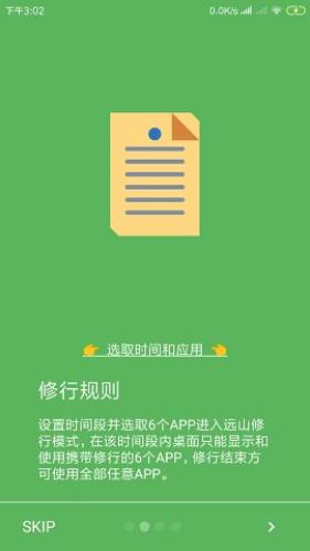 设置时间段并选取6个APP进入远山修行模式,在该时间段内桌面只能显示和使用携带修行的6个APP,修行结束方可使用全部任意APP。