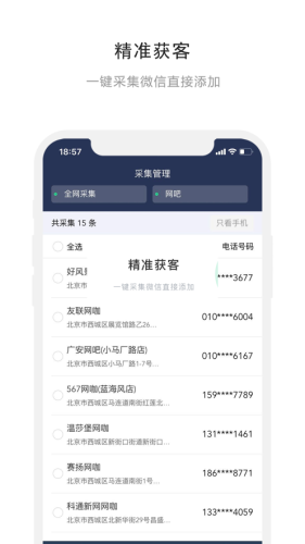 3、【全网客源采集】:众多站点同时采集,是一款快速高效的集客工具。采集内容包括企业法人、个体老板、批发商、经销商、代理商等,采集到的客户可一键同步到通讯录,时时更新数据,精准度100%,适合所有企业销售开发使用。