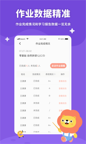 另外我们提供每个学生的学习报告数据,使老师可以及时掌握学生的学习情况,以便后续进行更有针对性的个性化教学。