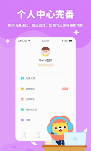 提供消息通知、班级管理、帮助与反馈等辅助功能