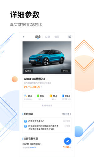 2、「车型库」覆盖新能源汽车详细参数配置、报价、图片,让你多方位了解新能源汽车;