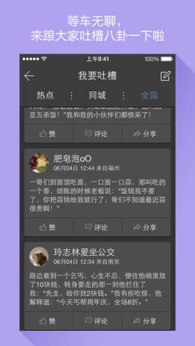 寂寞的等车时间,无聊的公交旅途,您可以看看【爆笑漫画】,还可以通过【我要吐槽】跟大家吐槽八卦、互动娱乐!