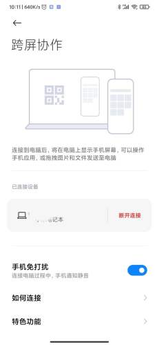 小米跨屏协作可通过扫码连接,连接成功后将在电脑上显示手机屏幕,可直接在电脑端操作手机,或将图片、文件拖拽到电脑。