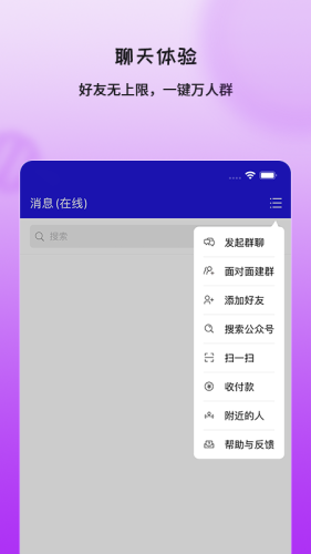 2、聊天消息:可以发文字消息、表情、图片、文件、语音、视频等,随时随地收发消息,还可以多端互传信息、文件等内容;