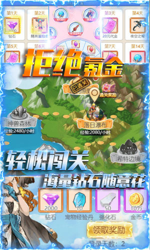 1、上线免费送VIP19、钻石*28888、金币*200W(邮件领取),拒绝氪金海量钻石随意花;