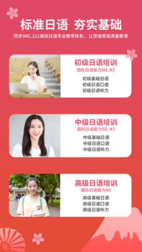针对日本每年面向全球组织的国际日本语能力测试而设置的过级通关课程,采用日本原汁原味最新版日本教材,主要针对N1、N2N3过级闯关而进行词汇、听力、文法、阅读四个考试类型全方位进行知识梳理、试题解析、真题训练,巩固和增加日语能力,提升答题准确度和速度,为取得高分、满分而设置。
