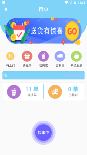 1、进入首页点击开始接单,无需多等就能得到新的订单