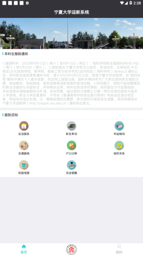 3.通知公告:本科新生接到录取通知书后,请于2020年9月5日之后,登录宁夏大学迎新网,在“报到流程”模块中填写个人基本信息,完成网上报到注册。届时本模块将为广大新生提供新生报到注册、接站服务、到校路线、宿舍信息等迎新信息的查询功能。
