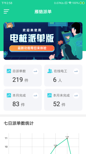 雁貉派单app,汽车充电桩维修管理软件。企业可以通过平台查询旗下充电桩维修数量,支持工单派发,实时查看维修任务进展,为管理者提供可视化的管理服务。