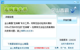 金山毒霸宏病毒专杀工具是毒霸资深反病毒工程师boom的业余作品。非常给力的一款用于解决Book1、Startup、Results、Poppy等office常见宏病毒软件。功能强大,非常实用。